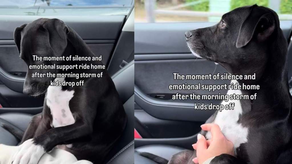 The video shows the dog sitting calmly in the car as the noise of the morning fades away. After kids are dropped off at school, the pup appears to need a few moments and a car ride to emotionally recover from the whirlwind that just ended. In the clip, the dog rides home with Michelle, processing the sudden calm after the kids leave. The text overlay reads: “The moment of silence and emotional support ride home after the morning storm of kids drop off.” The pup sits quietly, soaking in the stillness and leaning into the comfort of being close to their owner. The caption sums up the feeling bluntly and humorously: “Because wtf was that.”
