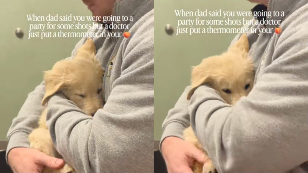 A Golden Retriever puppy has melted hearts online after a video showed the tiny pup clinging tightly to his owner during a vet visit. The clip, shared by @asillygoldengoose, captures a moment many pet owners will instantly recognize, and when cuddles become the only solution.