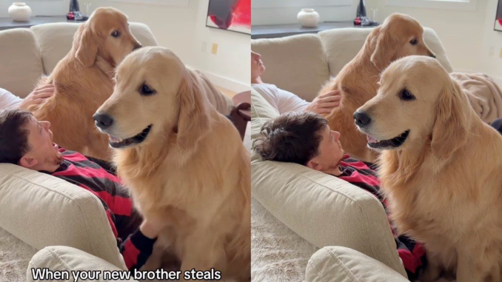 The video, posted by @lifeofsterlingnewton, features two Golden Retrievers, Sterling and Collin, sitting on a couch with their human brother, Tyler. At first glance, it appears to be a calm and cozy scene, with both dogs settled comfortably beside him. However, the mood quickly shifts once Tyler begins giving “scritchies” exclusively to Collin, the younger of the two.